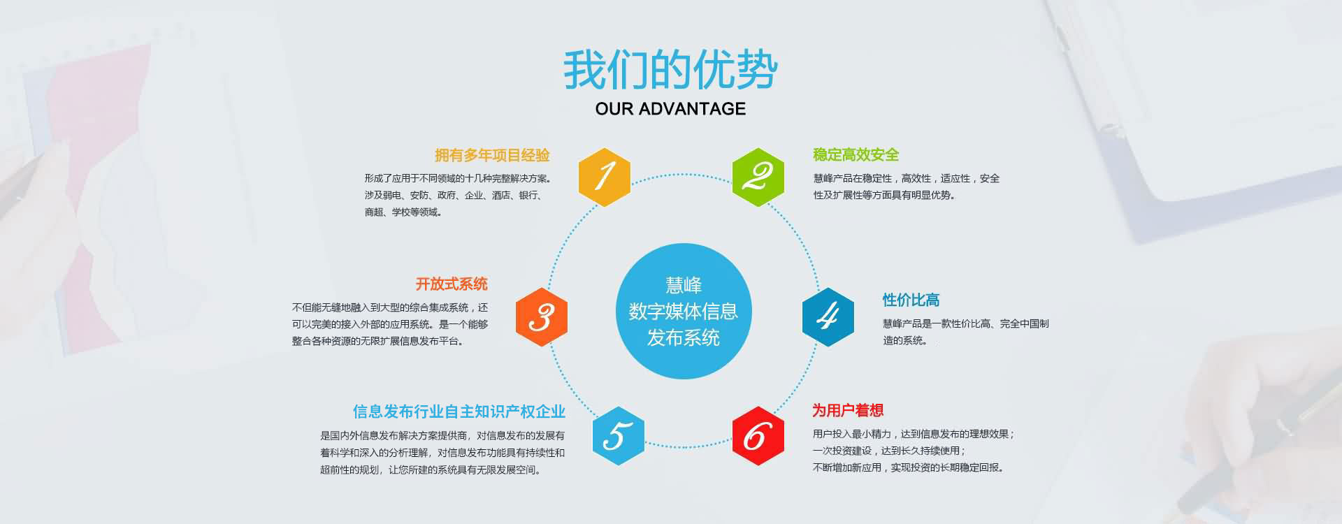 公司不僅具有開(kāi)發(fā)大型項(xiàng)目的豐富經(jīng)驗(yàn),還擁有維客計(jì)算機(jī)遠(yuǎn)程控制系統(tǒng),慧峰數(shù)字媒體發(fā)布系統(tǒng),慧峰會(huì)議預(yù)約管理系統(tǒng), 慧峰音視頻流媒體服務(wù)器系統(tǒng),慧峰智能數(shù)據(jù)處理系統(tǒng),數(shù)字化企業(yè)任務(wù)進(jìn)程管理系統(tǒng),智能演講提示系統(tǒng),會(huì)議自動(dòng)智能 排座系統(tǒng)等具有自主知識(shí)產(chǎn)權(quán)的產(chǎn)品。